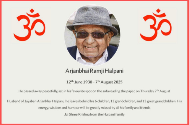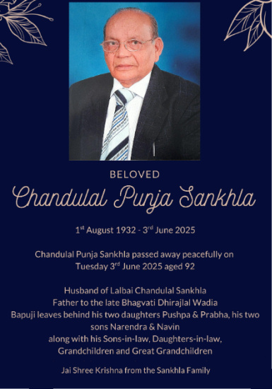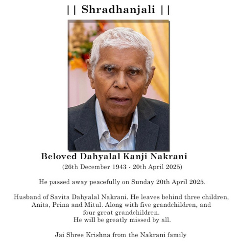 Harji Arjan Nakrani passed away peacefully on Friday 3rd March 2017. He will be greatly missed by his family.