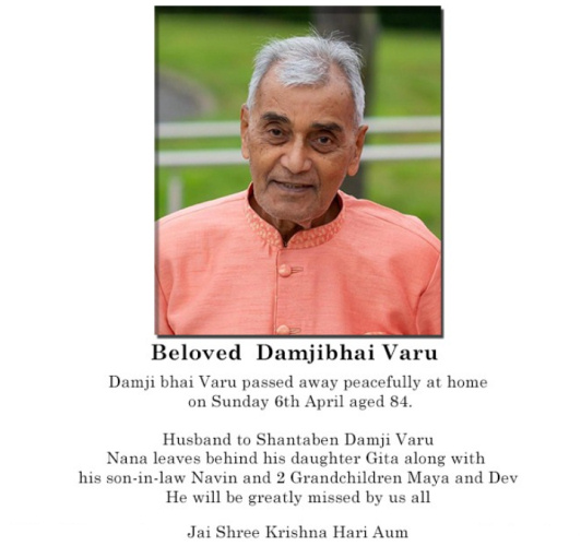 He passed away peacefully on Friday 5th June at 6pm. He leaves behind his wife Hiraben, three daughters Sushila, Saroj, Sarla and son Dinesh and their respective families. He will be missed by family,his grandchildren and friends.