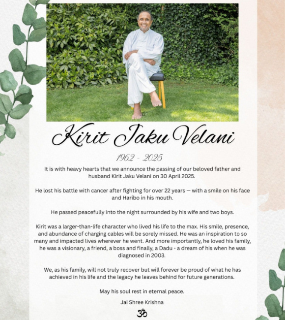 It is with great sadness that we announce the death of our father Gangadhar Meghji Velani who passed away peacefully on 27th April 2020 at the age of 81. We will all miss him dearly.