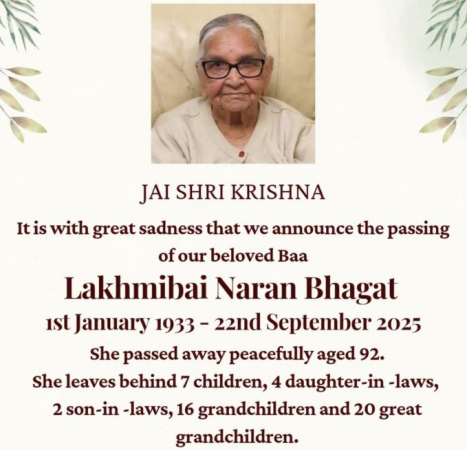 Jivabai Ladha Bhagat passed away on Wednesday 27th December 2017. She will be greatly missed by her family and friends.